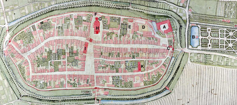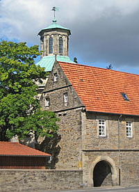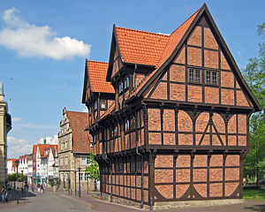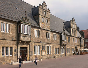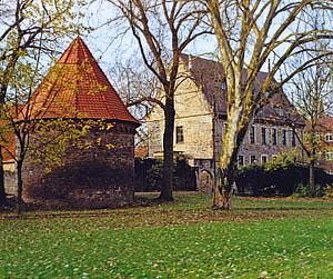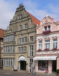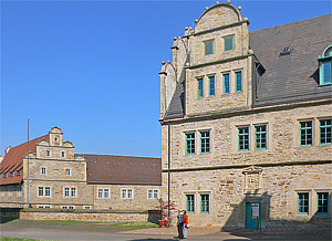heutigen Trauzimmer. In mitten der stattlichen Fachwerkhäuser und neben den reich dekorierten Fassaden der Gründerzeit steht am Markt das mit Volutengiebeln geschmückte ehem. städtische Brauhaus. Um 1610 errichtet, ist es mit seiner hohen Utlucht über drei Stockwerke und der feinen Gliederung mit Simsen, Konsolen und Säulen ein ausdruckstarkes Beispiel für den Stil der späten Renaissance im Weserraum. Von der Obernstraße durch einen schmalen Gang zu erreichen ist der Landsbergsche Hof. An den Wallanlagen gelegen schließt dieser "adlige Freihof" an das ehem. Vorwerk des Schlosses an. |