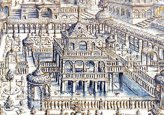 Architektur": von hohen Lauben-gängen umschlossene Gartenhöfe, mit