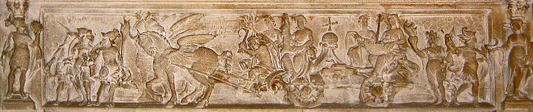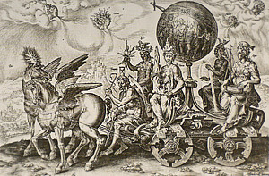 | Maarten van Heemskerks Zeichnungen sind zu einem konkreten Anlass entstanden: dem Umzug zum Fest der Beschneidung Christi am 1. Juli 1562 in Antwerpen. Auf 8 üppig geschmückten Festwagen zogen die Allegorien des Kreislaufs der Welt an den Zuschauern vorbei. Auf dem ersten Wagen war die Welt darge-stellt, in der Personifizierung der vier Elemente, wie sie auf dem Kaminfries zu sehen sind, dann folgten der durch den Handel erworbene Reichtum, der zum Hochmut verführt, der wiederum den Neid erzeugt, aus dem der Krieg entsteht, der zur Armut führt, die zur Demut zwingt, die zu guter letzt den Frieden bringt, in dem der Handel wieder blühen kann ... Das neunte Blatt zeigt, dem Anlass entsprechend das „Jüngste Gericht“. |