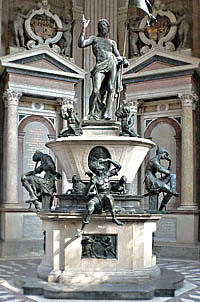 bestimmt den Raumeindruck von klassischer Würde. Dieses Gesamtkunstwerk aus Architektur, Plastik und Malerei führte in der norddeutschen Provinz über die Jahrhunderte einen "Dornröschenschlaf" und es existieren nur wenige Nachrichten über prominente Besucher. Wer es jedoch besichtigte, äußerte sich enthusiastisch, wie Georg Christoph Lichtenberg in einem Brief vom 7.September 1772: "Die Nacht blieben wir in Stadthagen, wo über dem Begräbnis der Grafen von Bückeburg ein Monument steht, das selbst der Abtei von Westminster zur Zierde gereichen könnte." Bis heute ist es im Eigentum des Fürstenhauses und diente bis zum Bau des neuen Mausoleums in Bückeburg über fast drei Jahrhunderte als Grablege der Schaumburger Landesherrn. |