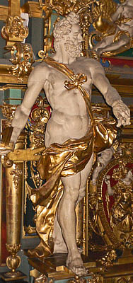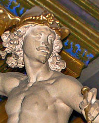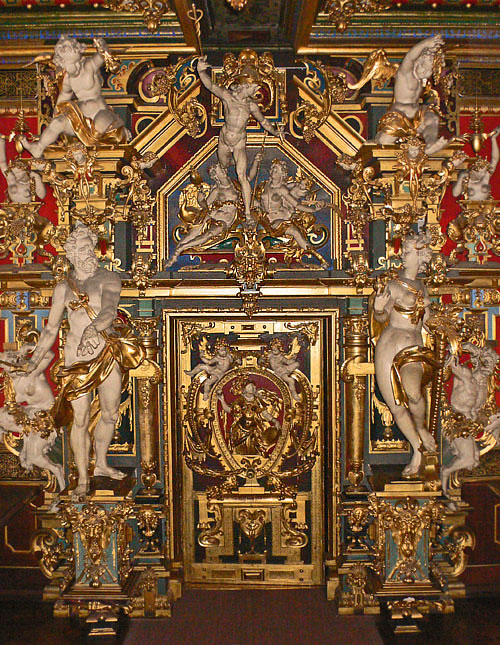 Auswärtigen Künstlerpersönlichkeiten mit denen der Fürst in regem Austausch stand, enttäuschten ihn trotz umfangreicher Aufträge durch Unzu-verlässigkeit und vermeintlich unverhältnismäßig hohe Forderungen. Dem sächsischen Hofarchi-tekten Giovanni Maria Nosseni, der anfänglich nur als Lieferant mehrfarbiger Marmorböden in Erscheinung tritt, fällt bis zum Zerwürfnis über die Kosten des Mausoleums die wichtige Rolle des beratenden Architekten zu. Er setzt die Phantasien des Fürsten in Modelle um und stellt den Kontakt zum kaiserlichen Hofkünstler Adriaen de Vries her. Vermutlich durch Vermittlung Nossenis fanden Bilderfindungen Giambolognas, wie an der Figur des Mars exemplarisch zu sehen ist, Eingang in das künstlerische Repertoire der Gebrüder Wolff. Die Kleinbronze der Vorlage, die sich in Nossenis Besitz befunden haben könnte, setzten sie an der "Götterpforte" in lebensgroße Figuren um. |
